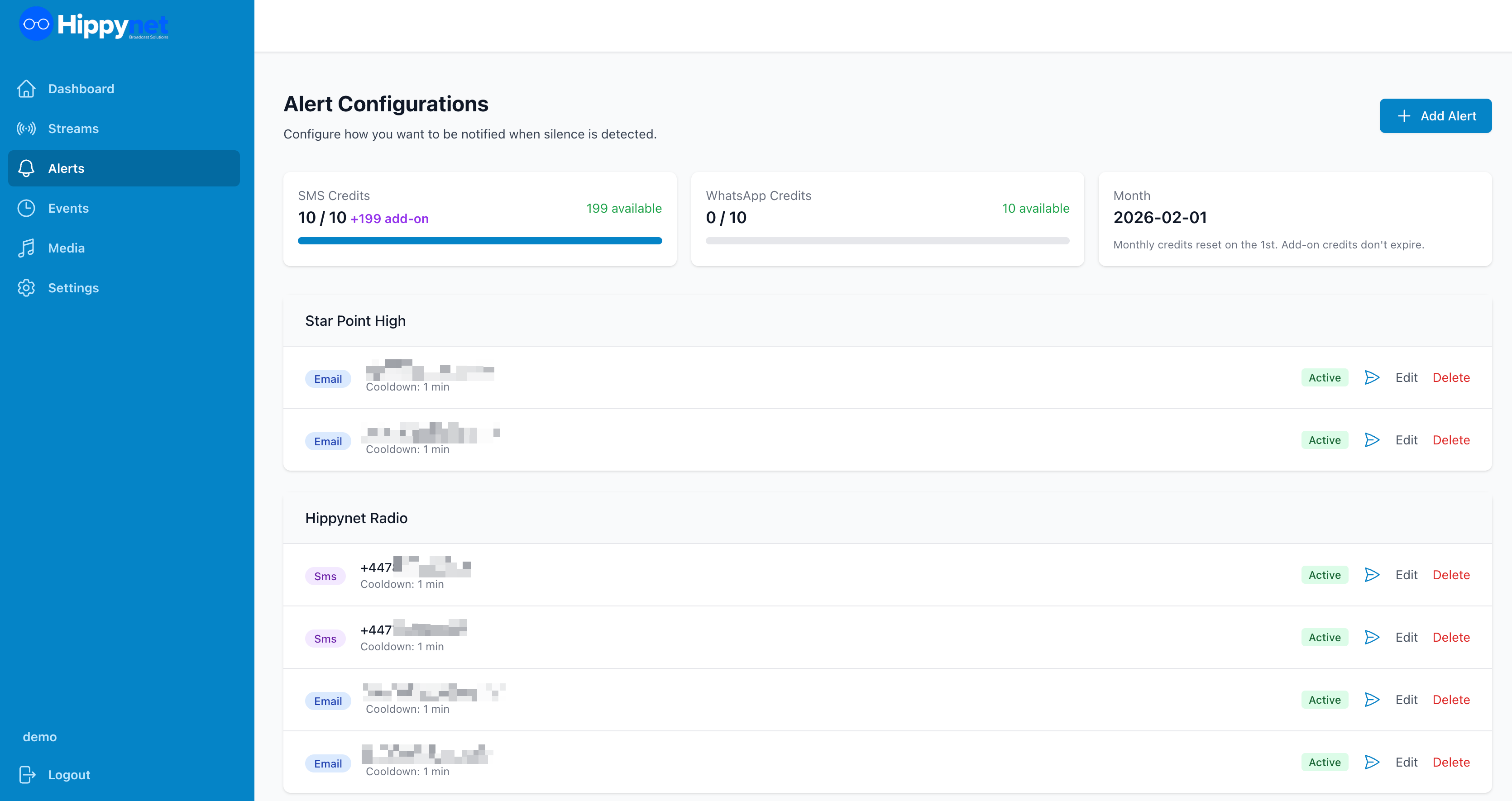 Your account includes a monthly allowance of SMS and WhatsApp messages. View your remaining quota at the top of the Alerts page.