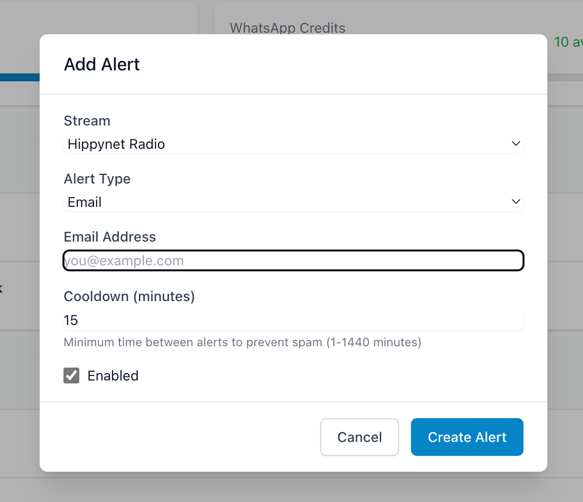 | Cooldown | Minutes to wait before sending another alert for the same stream. Prevents alert spam. Default: 15 minutes |